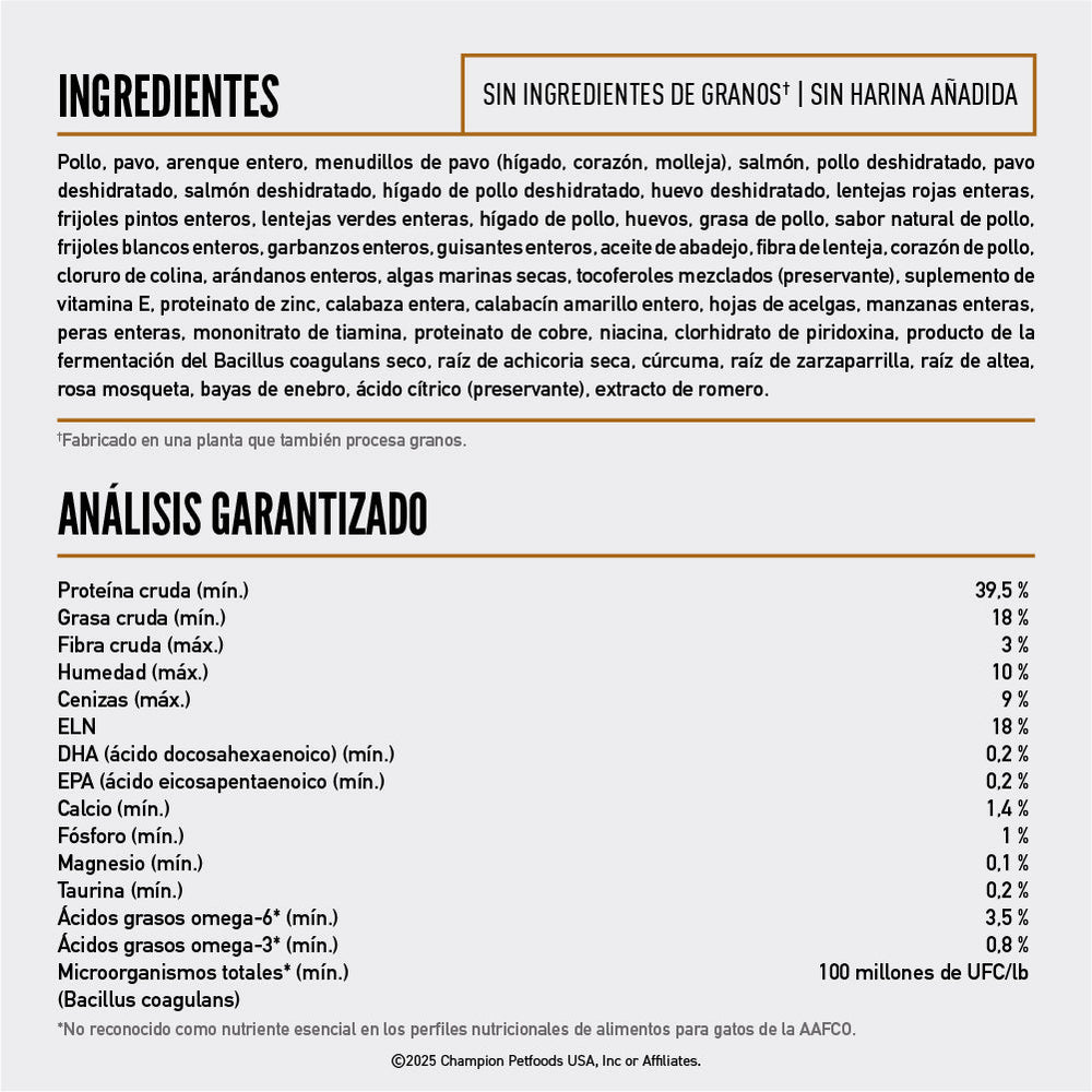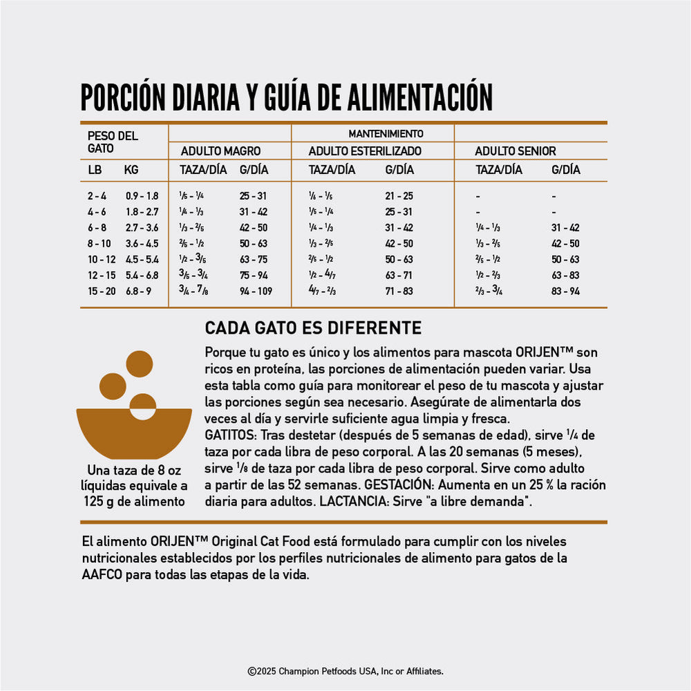 Alimento de la marca Orijen, Orijen Original Cat en presentación de 4lb, está diseñado para gatos adultos de todas las razas. Este alimento se enfoca en proporcionar una nutrición biológicamente apropiada mediante una dieta rica en proteínas, utilizando pollo y pavo criados en libertad, además de pescado capturado en su entorno natural. Su fórmula incluye una densidad nutricional excepcional que apoya la salud integral, el mantenimiento de la masa muscular y el brillo del pelaje. Es una opción de alta calidad que satisface los instintos biológicos de su mascota, garantizando su vitalidad y bienestar diario.