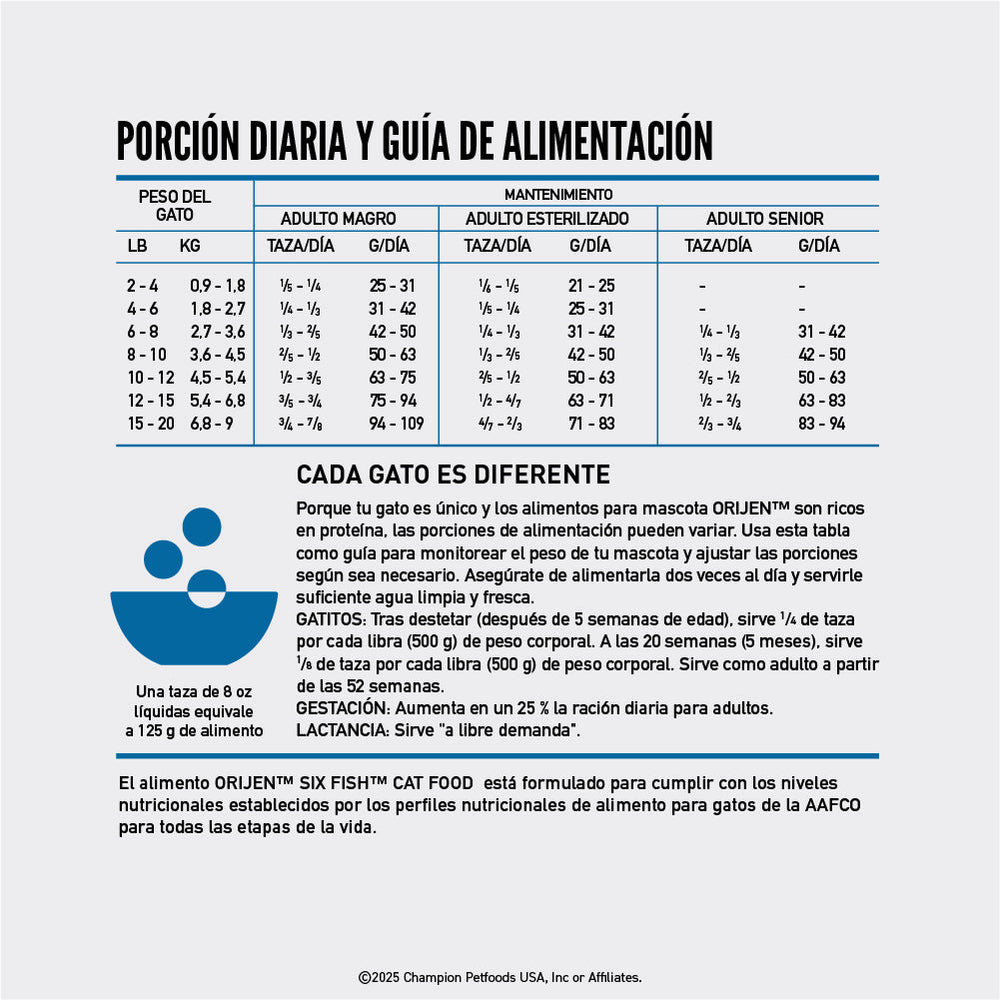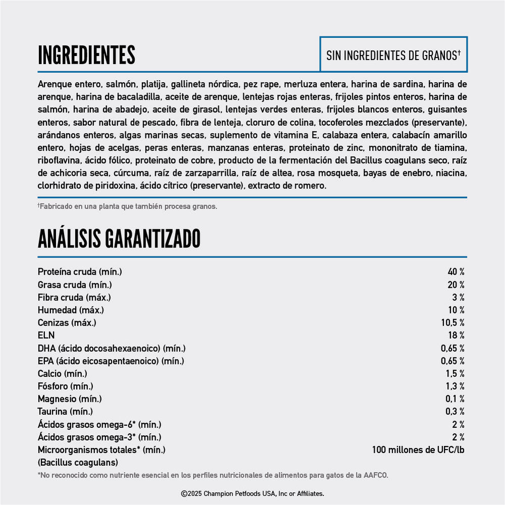 Alimento de la marca Orijen, Orijen Six Fish en presentación de 4lb, está diseñado para gatos adultos de todas las razas. Este alimento se enfoca en proporcionar una nutrición biológicamente apropiada basada exclusivamente en una rica variedad de pescados capturados en su entorno natural, como caballa, arenque y platija. Su fórmula es una fuente excepcional de ácidos grasos Omega-3, que son fundamentales para promover una piel saludable y un pelaje brillante, además de apoyar la salud cardíaca y articular. Es la opción ideal para gatos con paladares exigentes o sensibilidades a las proteínas de aves, garantizando que su mascota reciba una dieta premium llena de vitalidad.