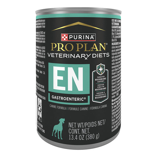 Alimento de prescripción húmedo de la marca Purina Pro Plan Veterinary Diets, en lata de 380 gramos, diseñado para perros adultos y cachorros con trastornos gastrointestinales agudos o crónicos. Su principal enfoque es el soporte nutricional en el manejo de la gastroenteritis, enteritis y pancreatitis, al ser altamente palatable y de muy fácil digestión. Su fórmula contiene proteínas, grasas y carbohidratos de alta digestibilidad y muy bajo contenido de fibra, lo que facilita la absorción de nutrientes esenciales y promueve la salud intestinal. Este alimento le proporciona a su perro un soporte nutritivo rápido y completo, ayudando a la recuperación y a la salud de la mucosa intestinal.